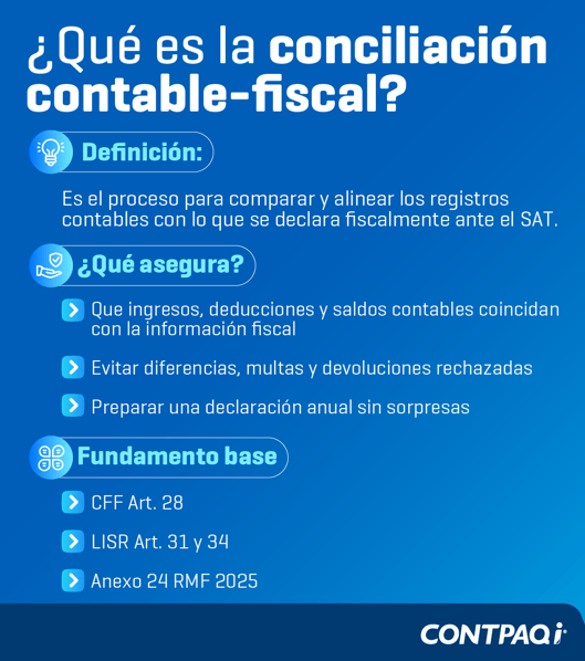 La conciliación contable-fiscal es el proceso mediante el cual se comparan y ajustan los registros de la contabilidad financiera con la información fiscal declarada ante el SAT, asegurando que ambos reflejen la misma realidad económica.