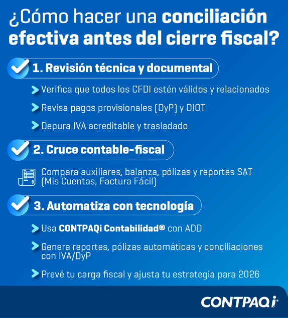 Realizar la conciliación antes del cierre fiscal (noviembre-diciembre) permite corregir inconsistencias a tiempo y evitar ajustes de última hora que afecten la declaración anual.