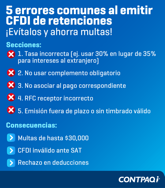 Uno de los errores más comunes es aplicar una tasa de retención incorrecta. Por ejemplo, al retener ISR en pagos a extranjeros, algunos contribuyentes aplican la tasa general (30%) en lugar de la tasa específica para intereses (35%) que establece la LISR 2025, Art. 160 fracción V.