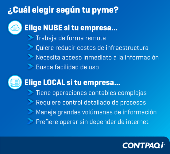 - Local: ofrece un control más profundo sobre la información, configuraciones y procesos contables.