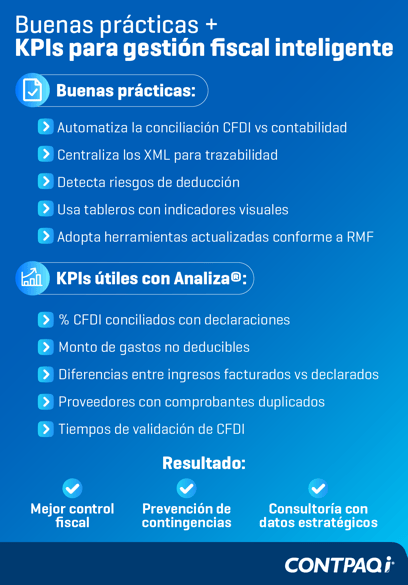 La Ley del Impuesto Sobre la Renta (LISR) 2025 establece requisitos estrictos para la deducción de gastos, entre ellos la autenticidad del CFDI y su vinculación con la actividad económica del contribuyente. La analítica ayuda a marcar partidas con riesgo y a documentar su corrección antes del cierre. - Integra la analítica con el cumplimiento normativo.